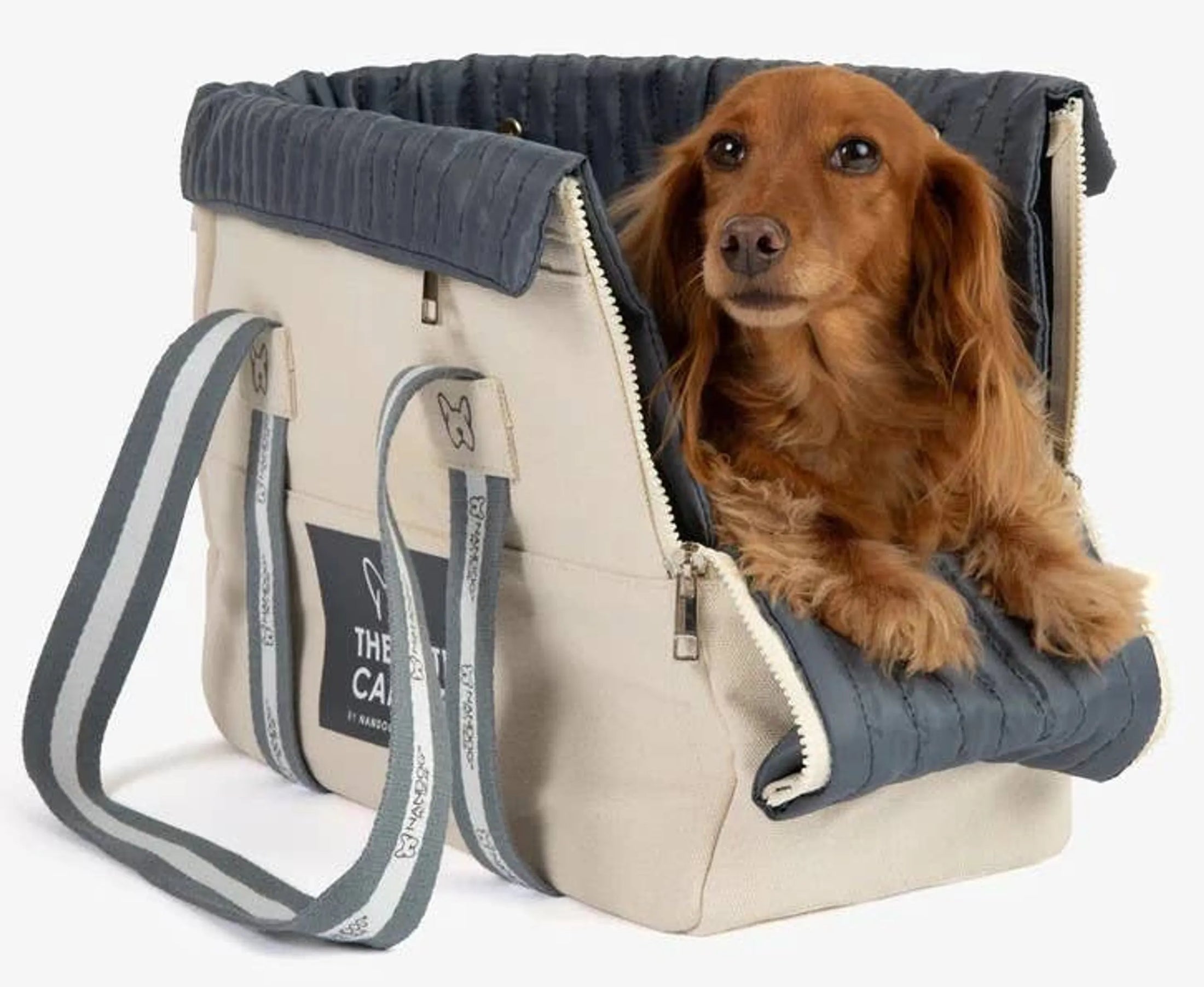 Elevate your urban adventures with the Nandog Dog City Tote Carrier, featuring a removable and washable inner lining to keep your pet cozy and your carrier clean. Customize your style with three interchangeable color straps in beige, gray, and neon yellow. Stay organized on the go with two hidden pockets for your essentials, while the dedicated treat pocket ensures quick rewards for your furry companion. Key Features: * Removable and washable inner lining for easy maintenance. * Three changeable color straps: beige, gray, and neon yellow. * Two hidden pockets to store personal items. * Dedicated treat pocket for convenient access to pet snacks. * Durable cotton canvas construction ensures comfort and safety for your pet during city outings. * RECOMMENDED to small dogs up to 10 lbs. * DIMMENSIONS 15 L x 7 W x 11 H inches.